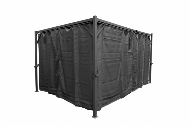 The set includes 4 grey curtains, perfectly matched with the pergola’s structure, and comes equipped with hanging rails for easy installation.