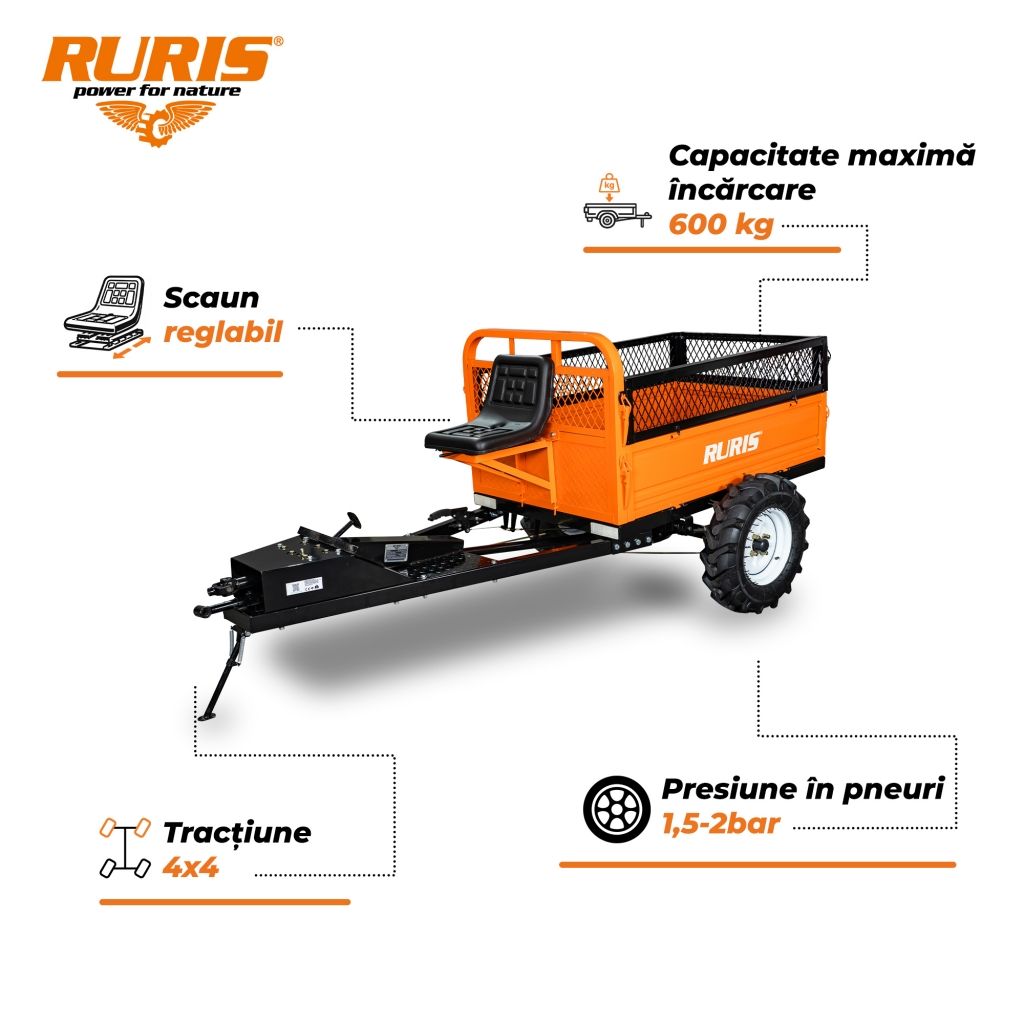 Prin combinația dintre 4x4 activ, diferențial, transmisie protejată și benă configurabilă, remorca RURIS 4x4 600S oferă continuitate în lucru și în condiții extreme, reduce efortul operatorului și crește fiabilitatea ansamblului. În timp, toate ac